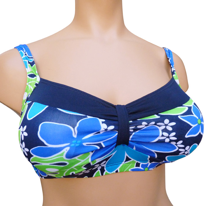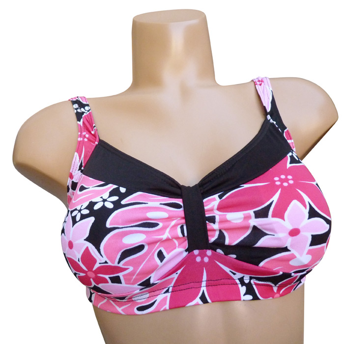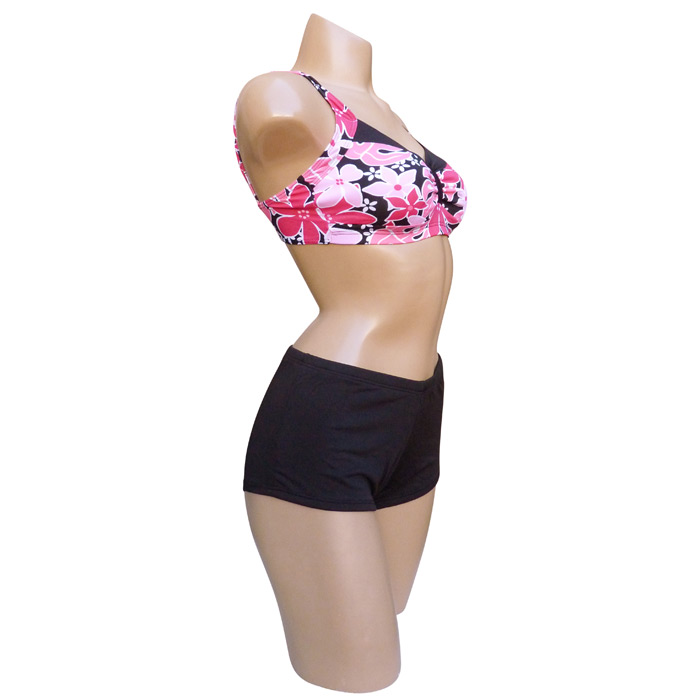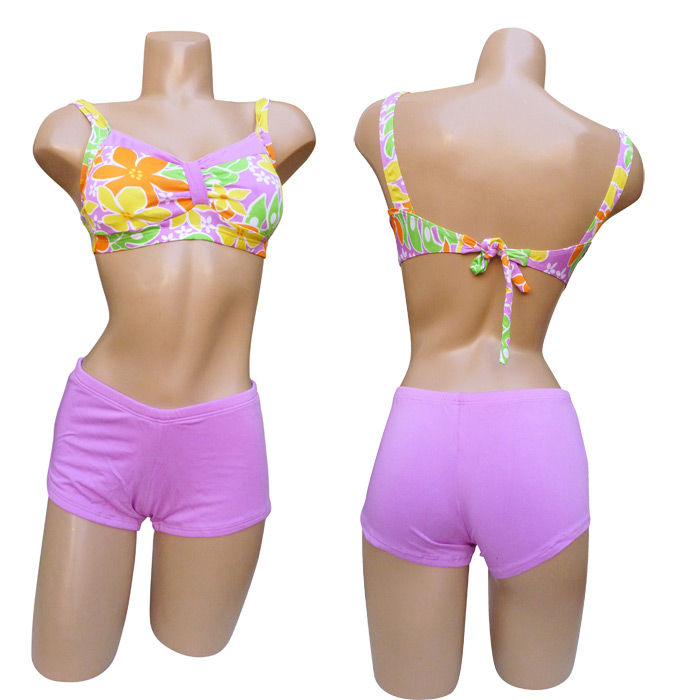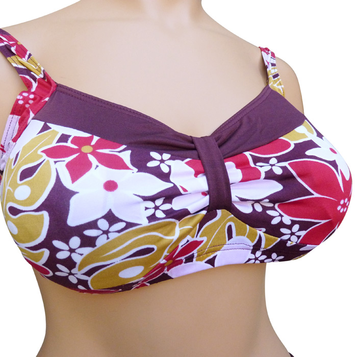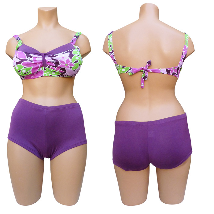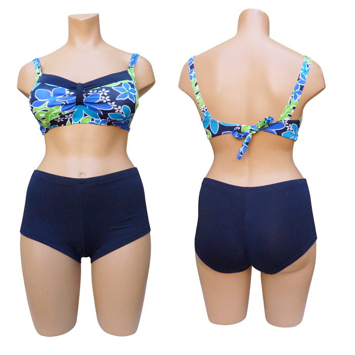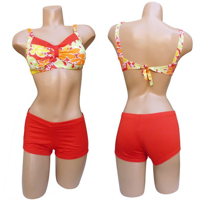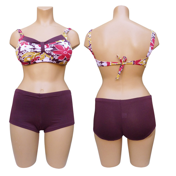 Maillot de bain 2 pièces boxer. Soutien gorge forme bandeau, sans armatures, petites mousses intégrées et amovibles. S'attache au dos. Imprimé "fleurs des îles" sur le soutien gorge. Boxer entièrement uni, doublé à l'avant. 3 tailles indiquées sur étiquette. Reste 3 pièces.