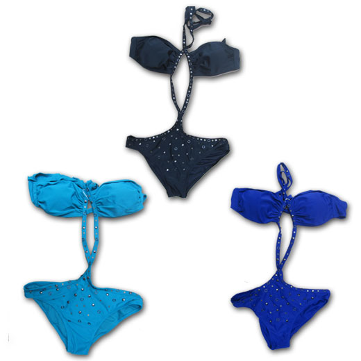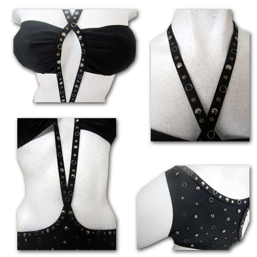 Trikini bandeau rembourré fin. 2 bandes cloutées entrecroisées à l'avant. Slip entièrement doublé. Attache cou. 4 tailles (42->48)